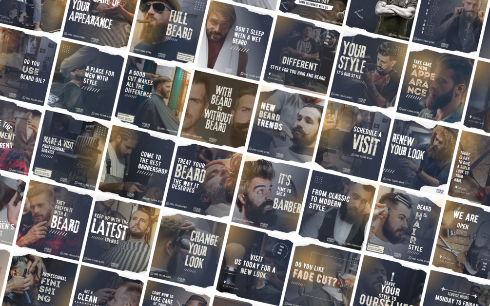 50 professionally designed Barbershop Social Media posts for Barbershops, Salons, and Digital Marketers to attract new leads, grow followers, and increase bookings.