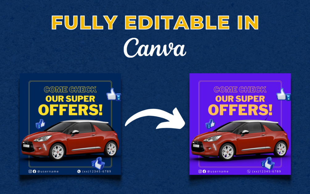 Car Dealer Social Media Templates are ideal for Instagram Posts, Twitter Posts, Facebook Posts, Pinterest Pins, and LinkedIn posts.