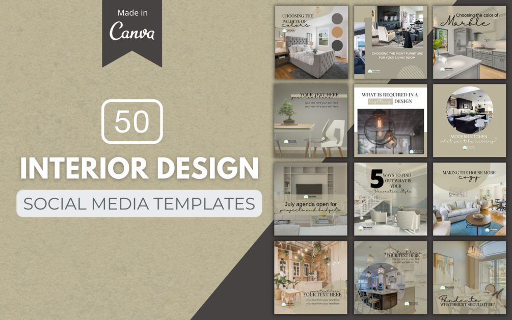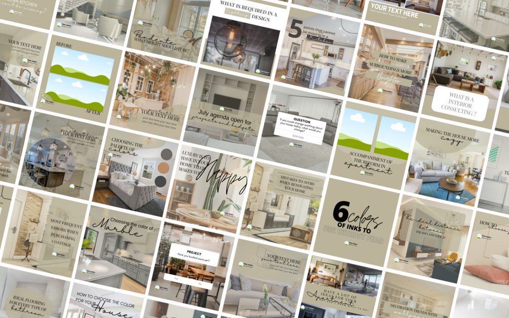 50 professionally designed Interior Design Social Media posts for Interior Designers, Interior Design Studios, and Digital Marketers to attract new leads, grow followers, and close deals.