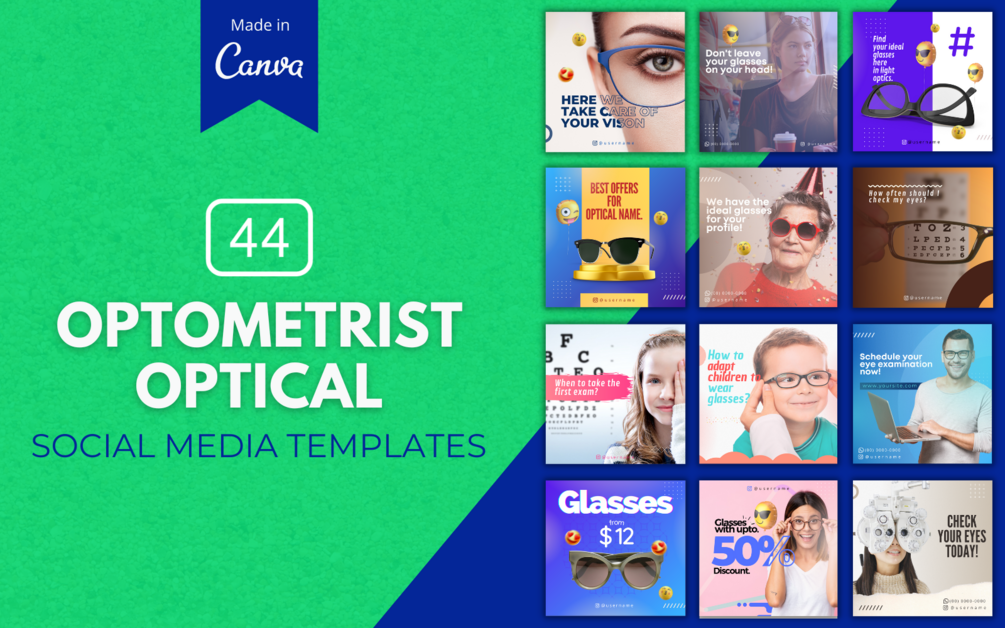 Optometrist Social Media Templates are ideal for Instagram Posts, Twitter Posts, Facebook Posts, Pinterest Pins, and LinkedIn posts.
