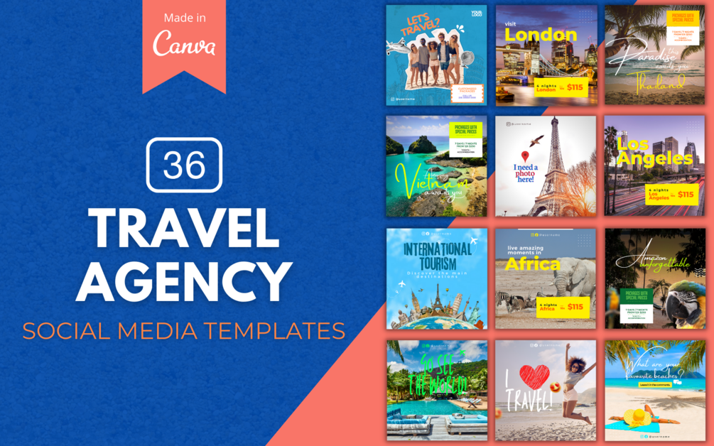 Travel Agency Social Media Templates are ideal for Instagram Posts, Twitter Posts, Facebook Posts, Pinterest Pins, and LinkedIn posts.